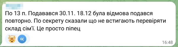 При цьому на людей очікують ще й численні “сюрпризи”. Наприклад, в ТЦК можуть сказати, що їм не стає даних про склад сім’ї і практично повністю зупинити процес або ж надати усім відмови.